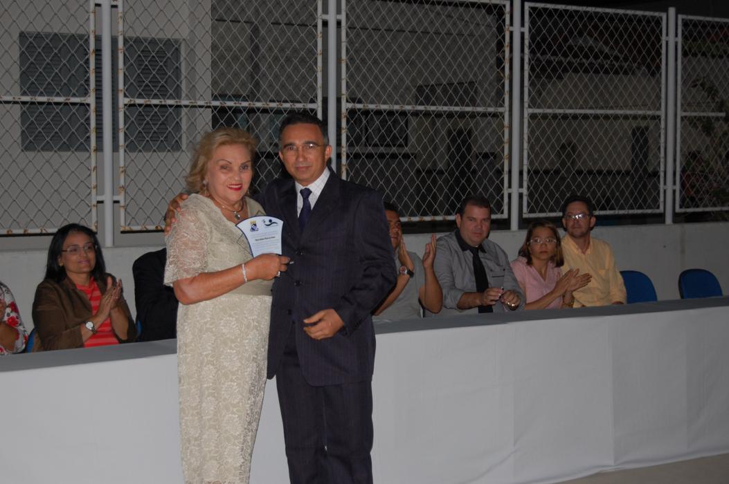 A homenageada Márcia Dutra recebendo a comenda CAP 31 ANOS das mãos da irmã professora Ms. Fátima Dutra, Chefe do Departamento de Matemática do CAP/UERN.